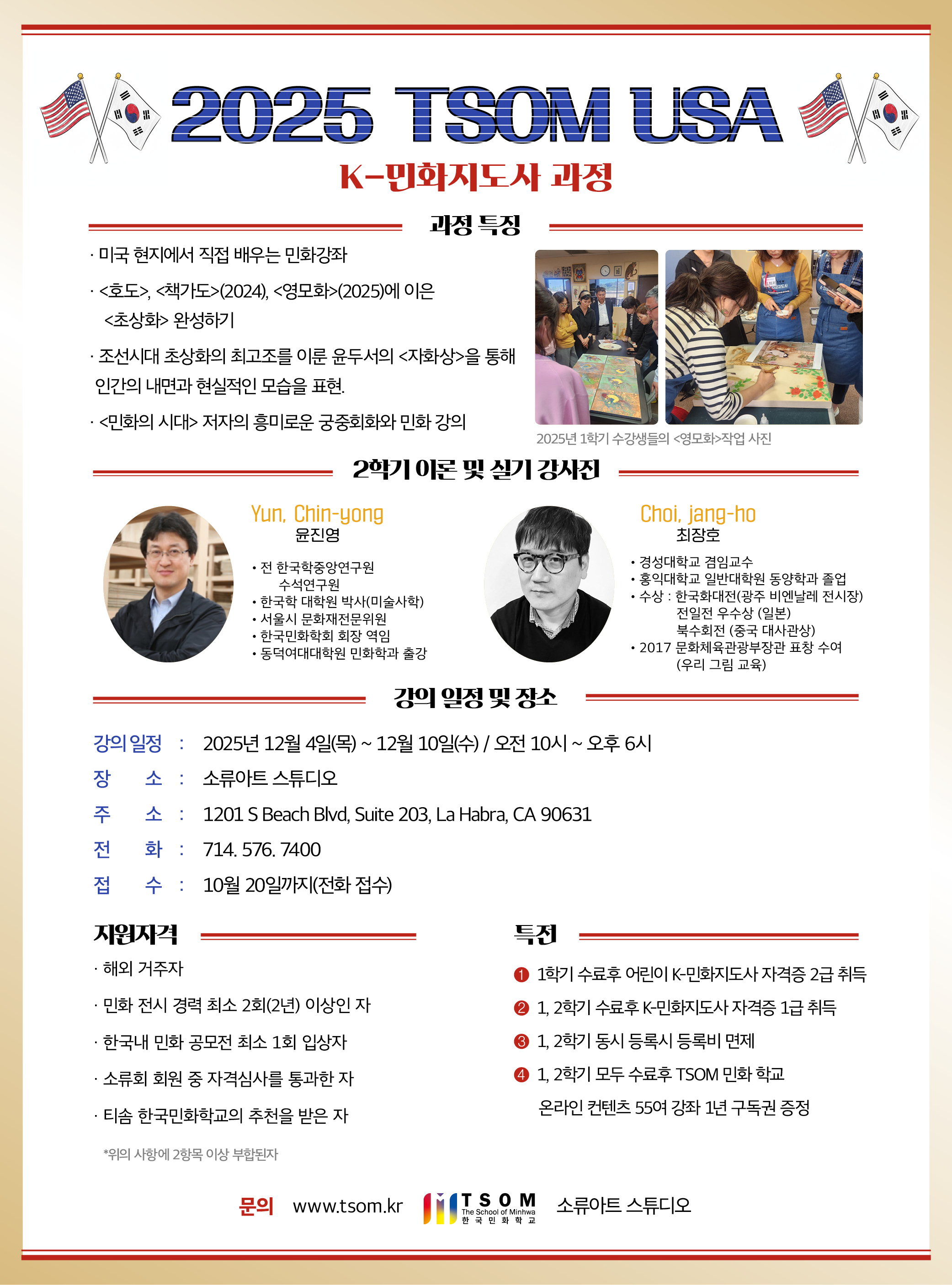 강의 2025 TSOM USA K-민화지도사 과정 2학기 책 정보 기간 2025.12.04 ~ 2025.12.10 장소 LA 소류아트 스튜디오 관람료 무료 주최/후원 TSOM / 소류아트스튜디오 연락처 관련사이트 https://www.tsom.kr/edu/board/readBbs.do?menu_step=community&board_cd=2&bbs_cd=1556&check_yn=&often_gbn=&n_page_no=1