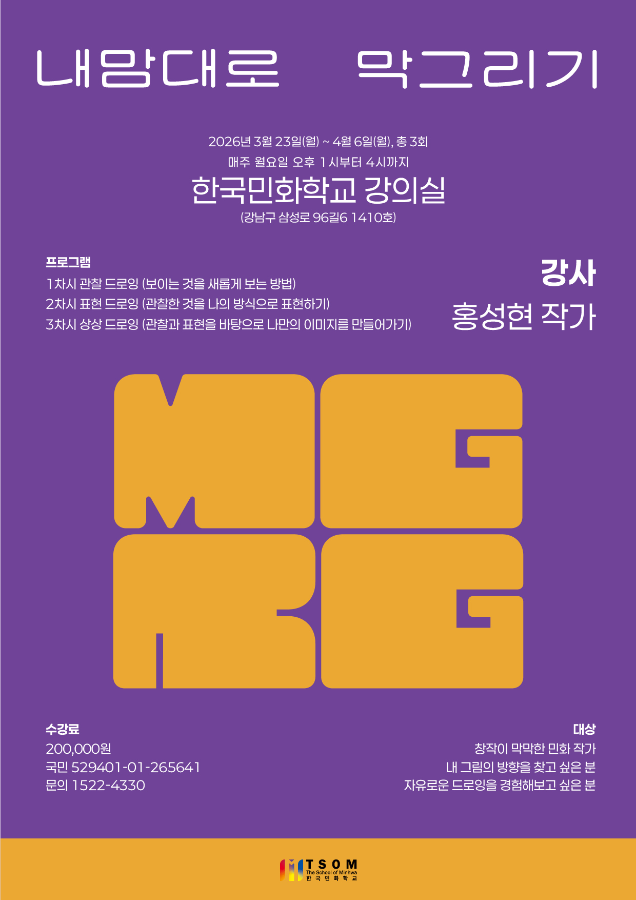 강의 내맘대로 막그리기 - 홍성현 작가 책 정보 기간 2026.03.23 ~ 2026.04.06 장소 강남구 삼성로 96길 6 LG트윈텔 1차 1410호 관람료 200,000원 주최/후원 한국민화학교 연락처 1522-4330 관련사이트