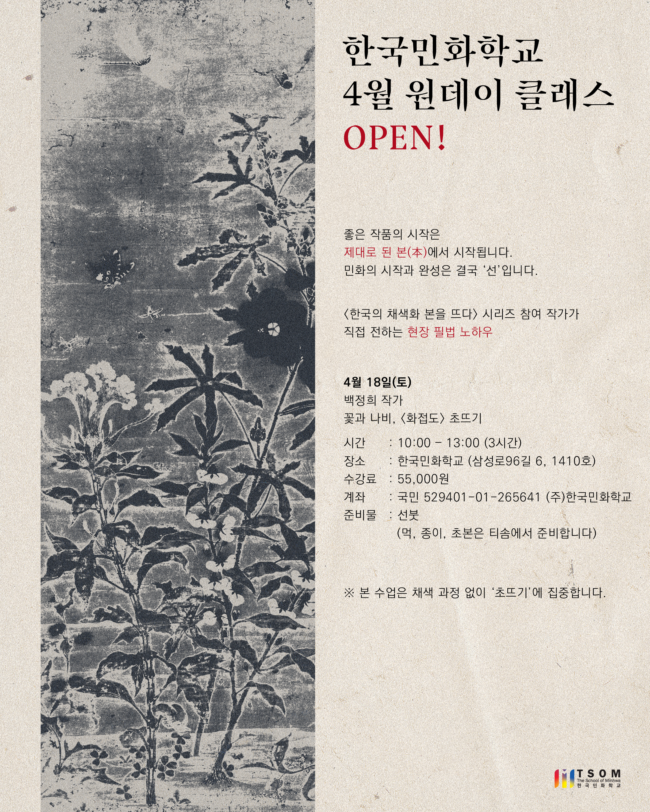 강의 한국민화학교 4월 원데이클래스 책 정보 기간 2026.04.18 ~ 2026.04.18 장소 강남구 삼성로 96길 6 LG트윈텔 1차 1410호 관람료 55,000원 주최/후원 한국민화학교 연락처 1522-4330 관련사이트