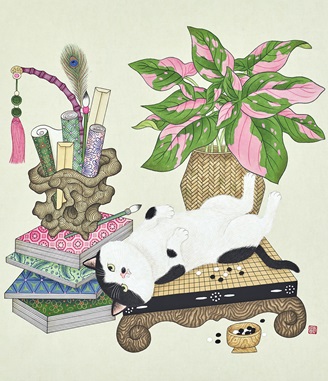 책가도를 모티브로 한 <지켜줄게 II>와 <태평성대>는 말할 것도 없고, 선인장을 중심 모티브로 한 <행복찾기>와 관엽식물을 중심 소재로 삼은<슬기로운 냥이생활> 연작 시리즈는 모두 책가 없는 책거리의 구도와 소재를 멋지고 세련되게 해석한 작품이다. 그런가 하면 마치 잘 만든 애니메이션의 한 장면같이 대상을 디자인화 시킨<묘란도>와 <향이 있는 미용실>은 각각 모란도와 연화도를 모던한 감각으로 해석한 작품이다.