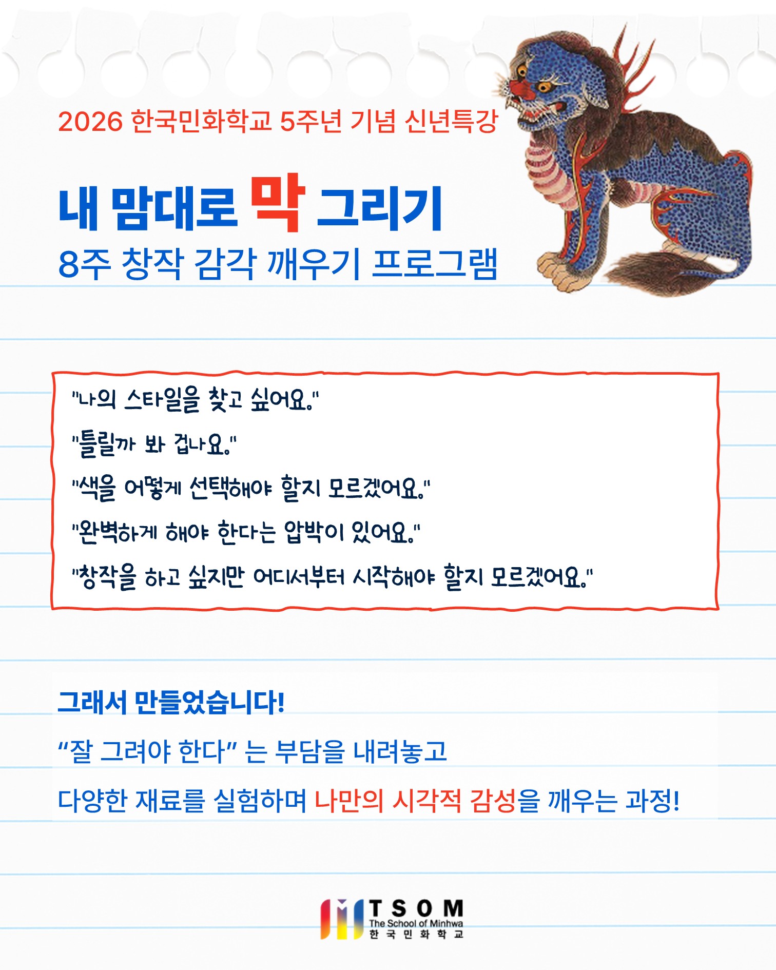 강의 2026 한국민화학교 5주년 기념 신년 특강 - 내 맘대로 막 그리기 책 정보 기간 2026.01.05 ~ 2026.03.02 장소 강남구 삼성로 96길 6 LG트윈텔 1차 1410호 예매 기간 2025-12-09. 0시 ~ 2026-01-05. 1시 예매중 금액 495,000원 주최/후원 한국민화학교 연락처 1522-4330 관련사이트 예매하기